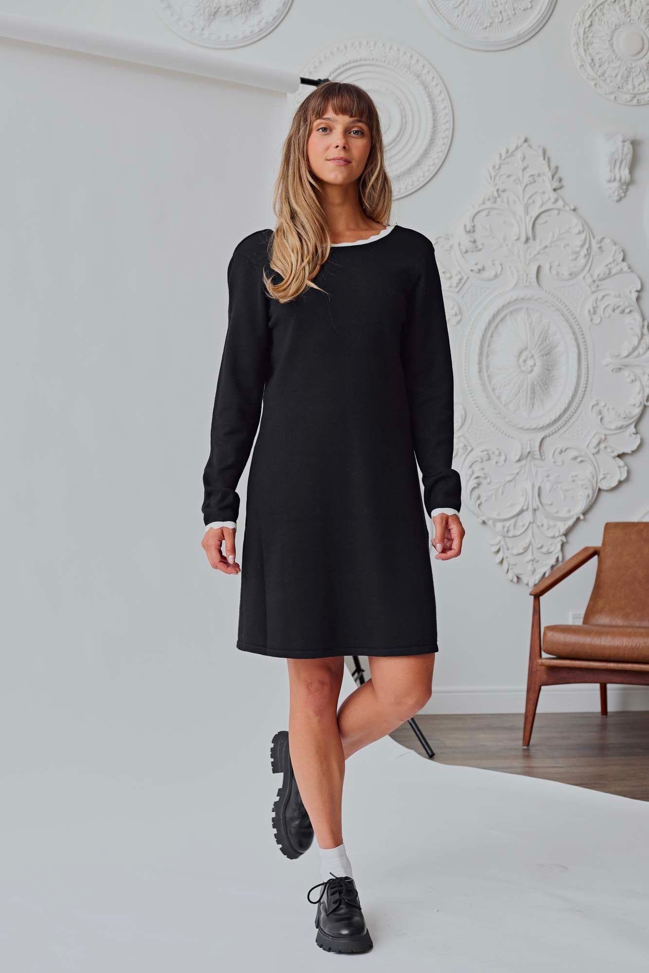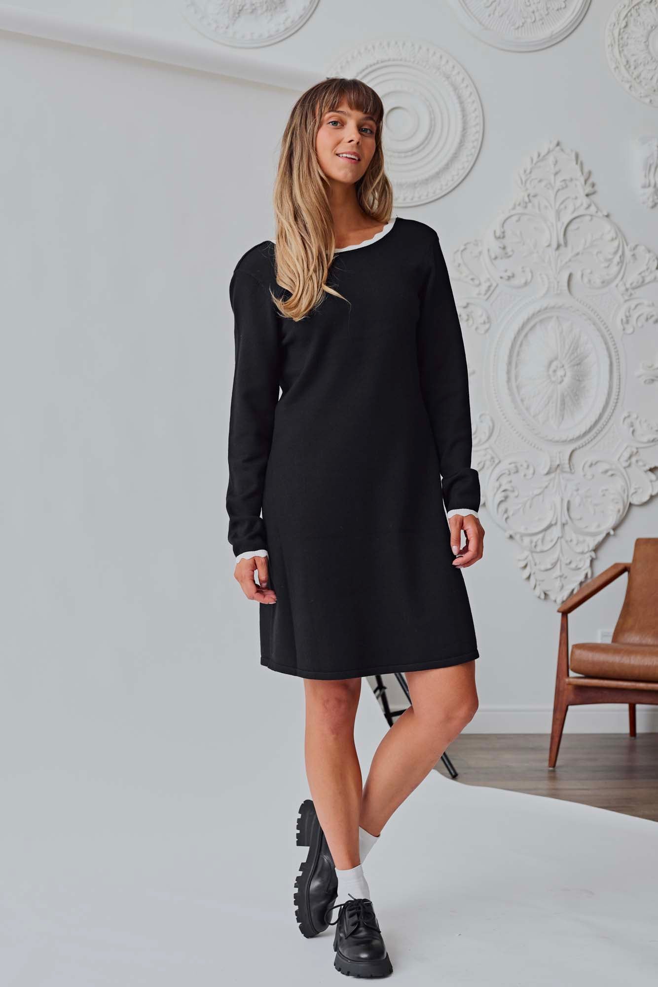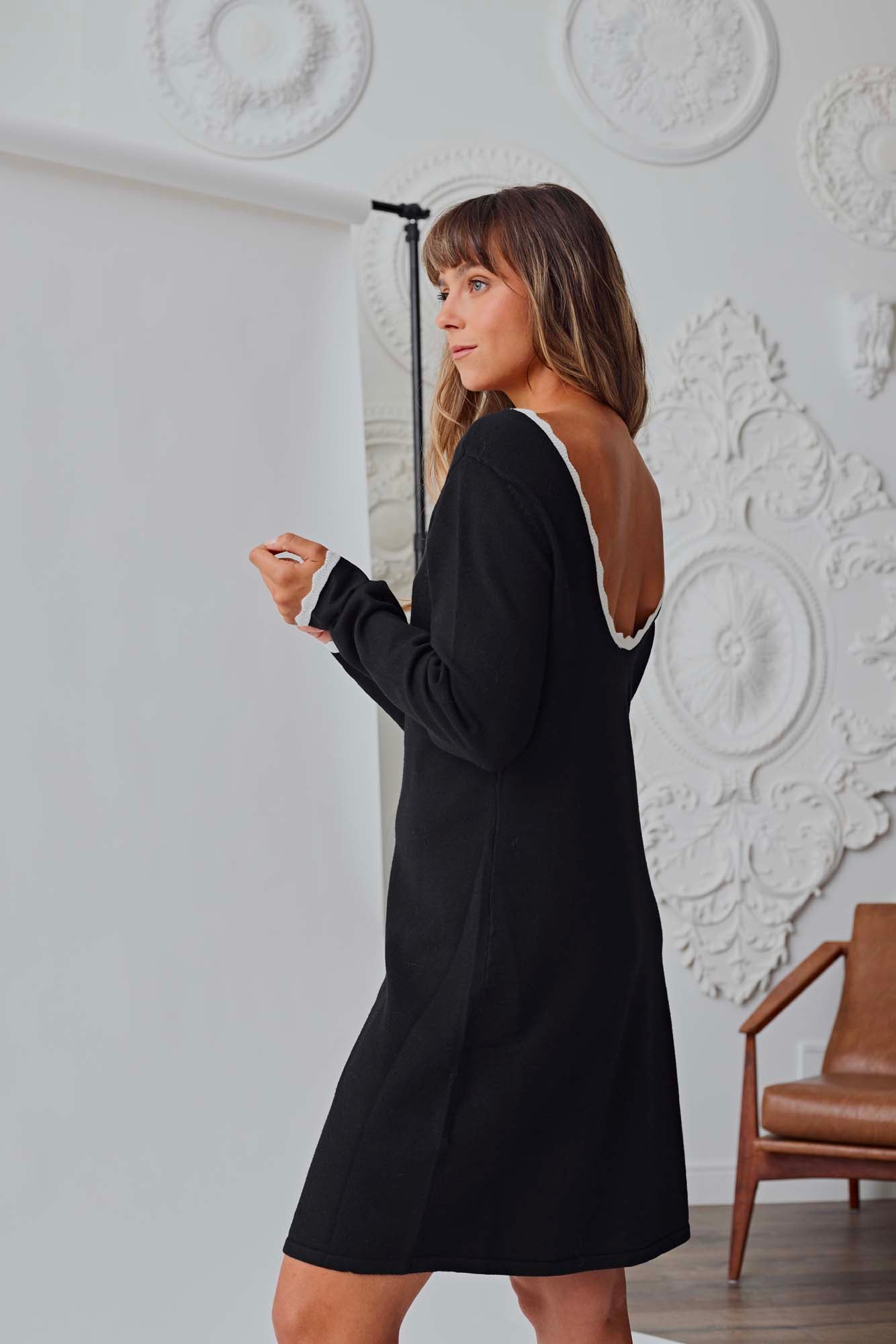 La robe noire présente une silhouette féminine et des détails festonnés à l'encolure et au bas. Sa coupe droite et ses manches longue lui confère une allure élégante et sophistiquée.