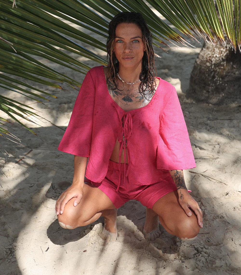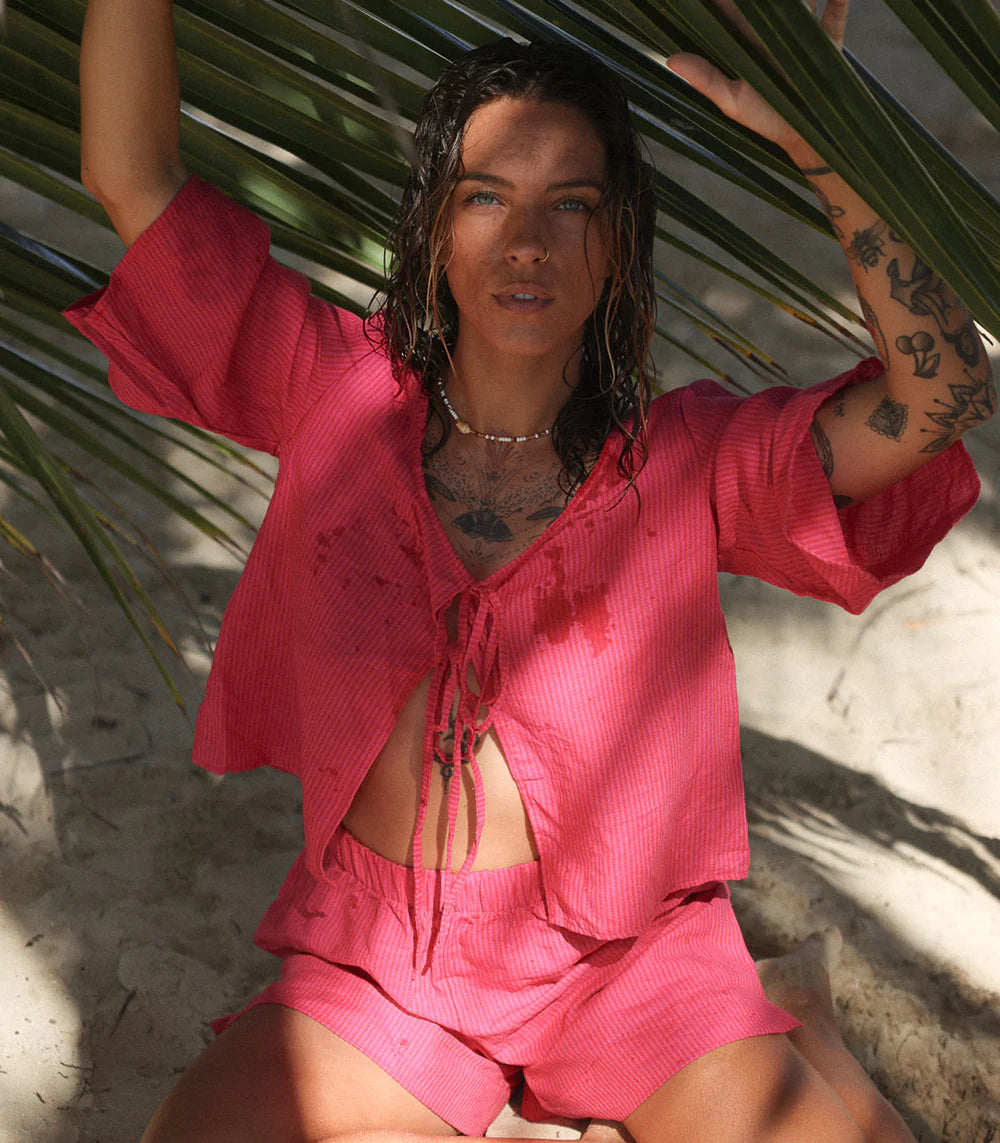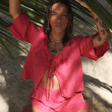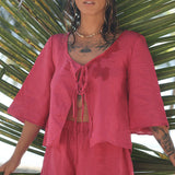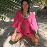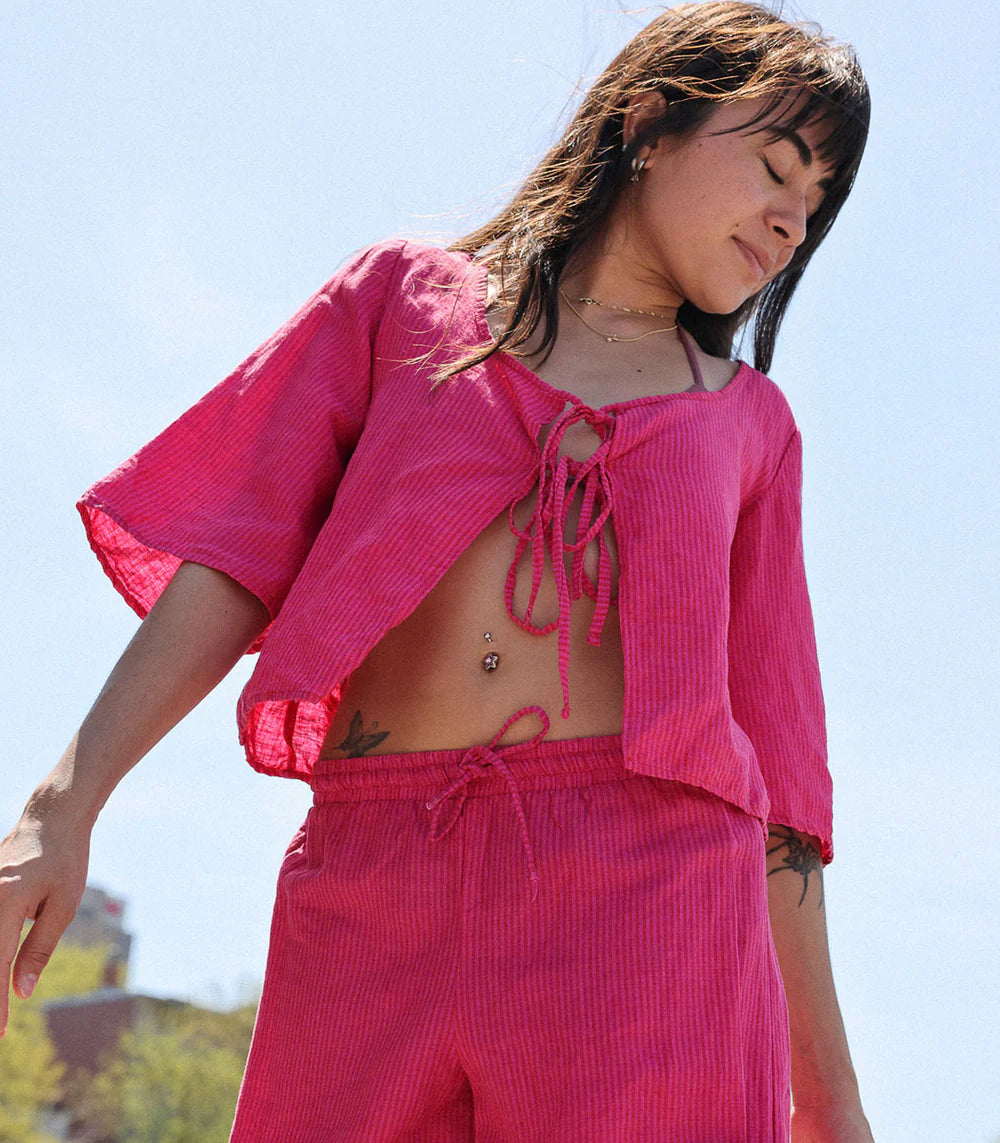 Joli haut passe-partout conçu pour vous suivre tout au long de l'été, autour d'un pique-nique entre amis, d'un apéro "fancy" ou près de l'eau et de la plage lors des journées chaudes.