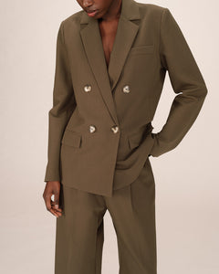 Le pantalon tailleur, à l'allure sophistiquée, est revisité avec des détails subtils. La coupe droite et la taille mi-haute structurent la silhouette, tandis que les plis sur le devant apportent une touche d'élégance classique.