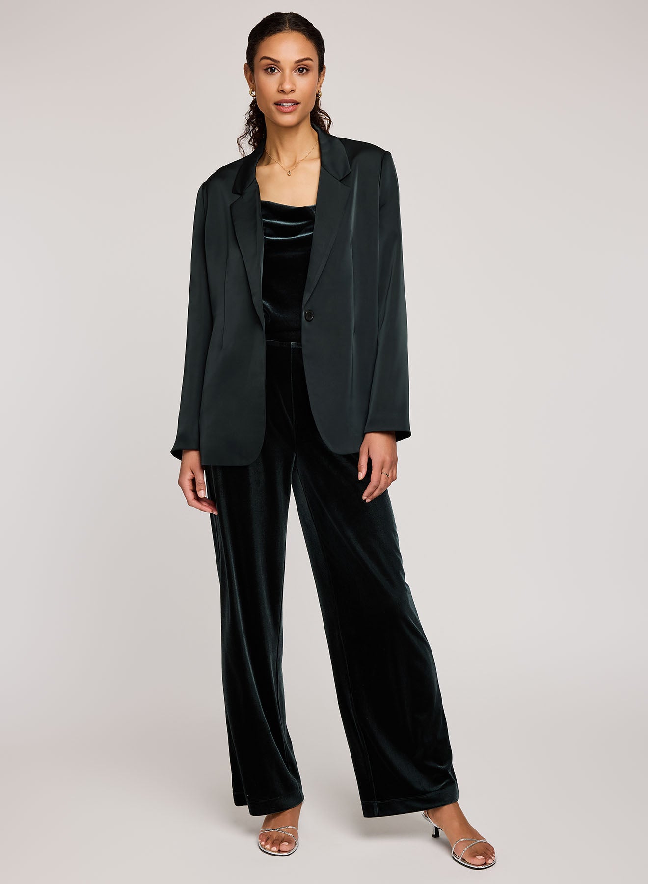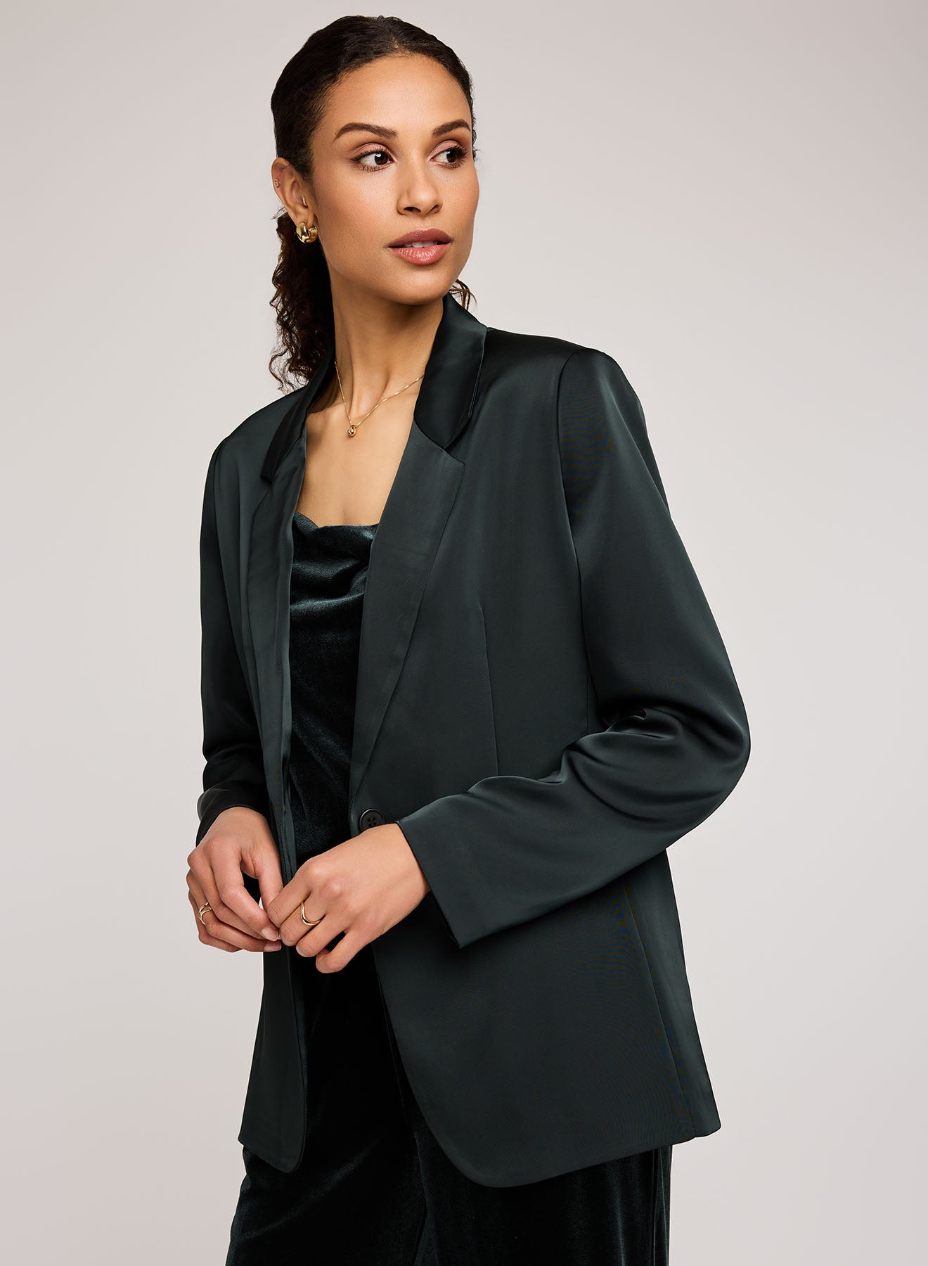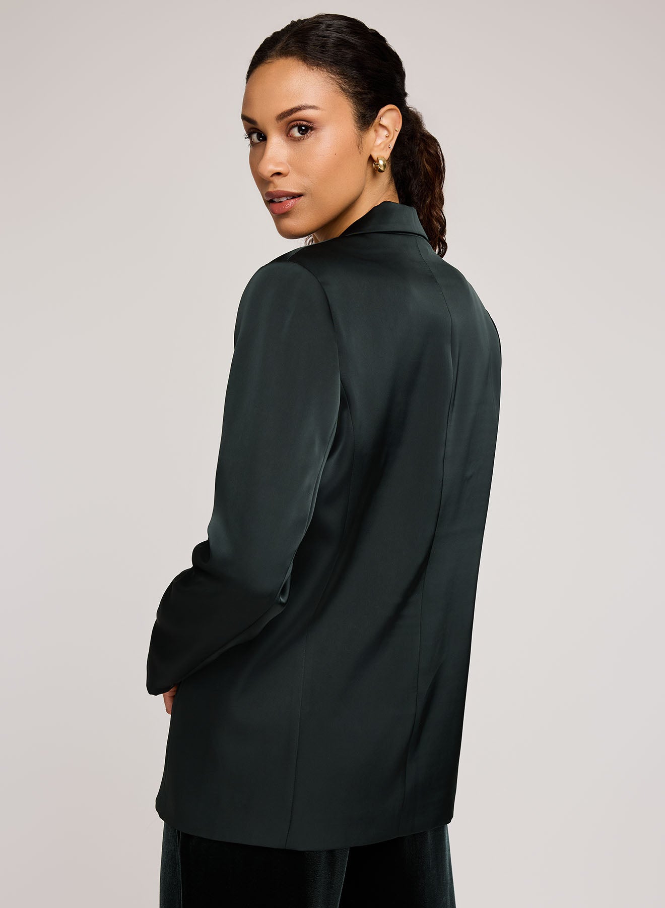 Le blazer Dione est confectionné dans un satin luxueux et entièrement doublé pour un confort optimal. Il présente un revers cranté et une fermeture boutonnée sur le devant. Complétez votre look avec le pantalon Amélie.