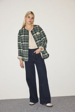 Le pantalon large présente une coupe décontractée et des plis ajustés, offrant un style polyvalent et un confort optimal tout au long de la journée. Sa taille haute et sa longueur complète créent une silhouette moderne, idéale pour les tenues professionnelles comme décontractées.