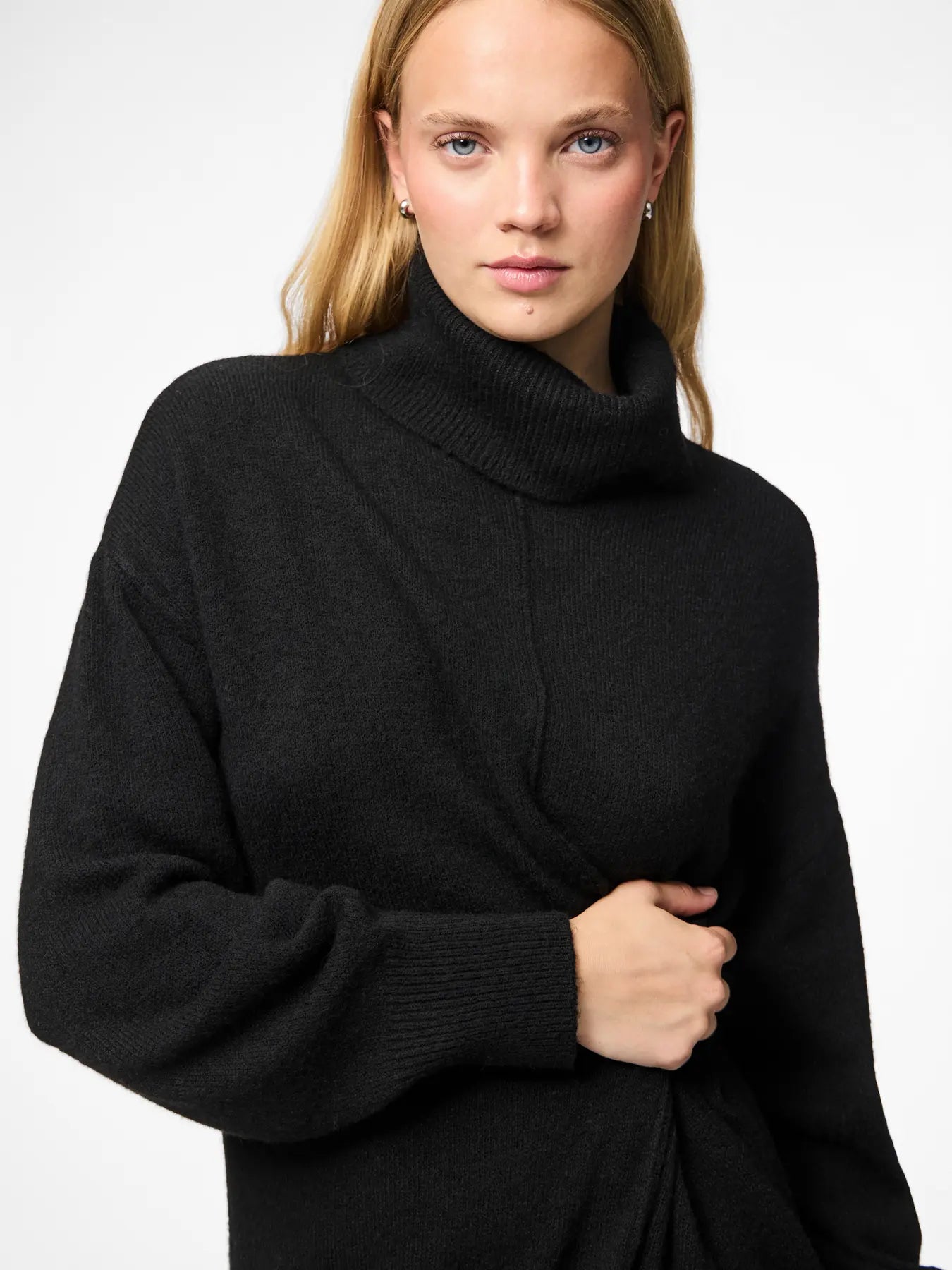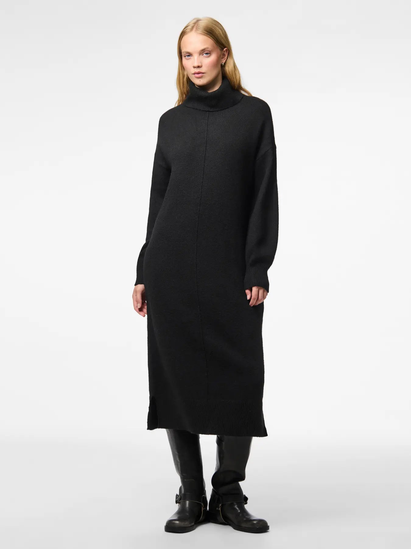 Une robe comme une confidence, douce et affirmée. Sa maille épaisse épouse les courbes sans les contraindre, tandis que le col roulé enveloppe le cou d’un halo de chaleur. La ligne verticale au centre trace une silhouette élancée, et les fentes discrètes aux côtés invitent au mouvement. Portée avec des bottes hautes, elle compose un tableau minimaliste, presque cinématographique. Une pièce forte, à la fois refuge et déclaration.