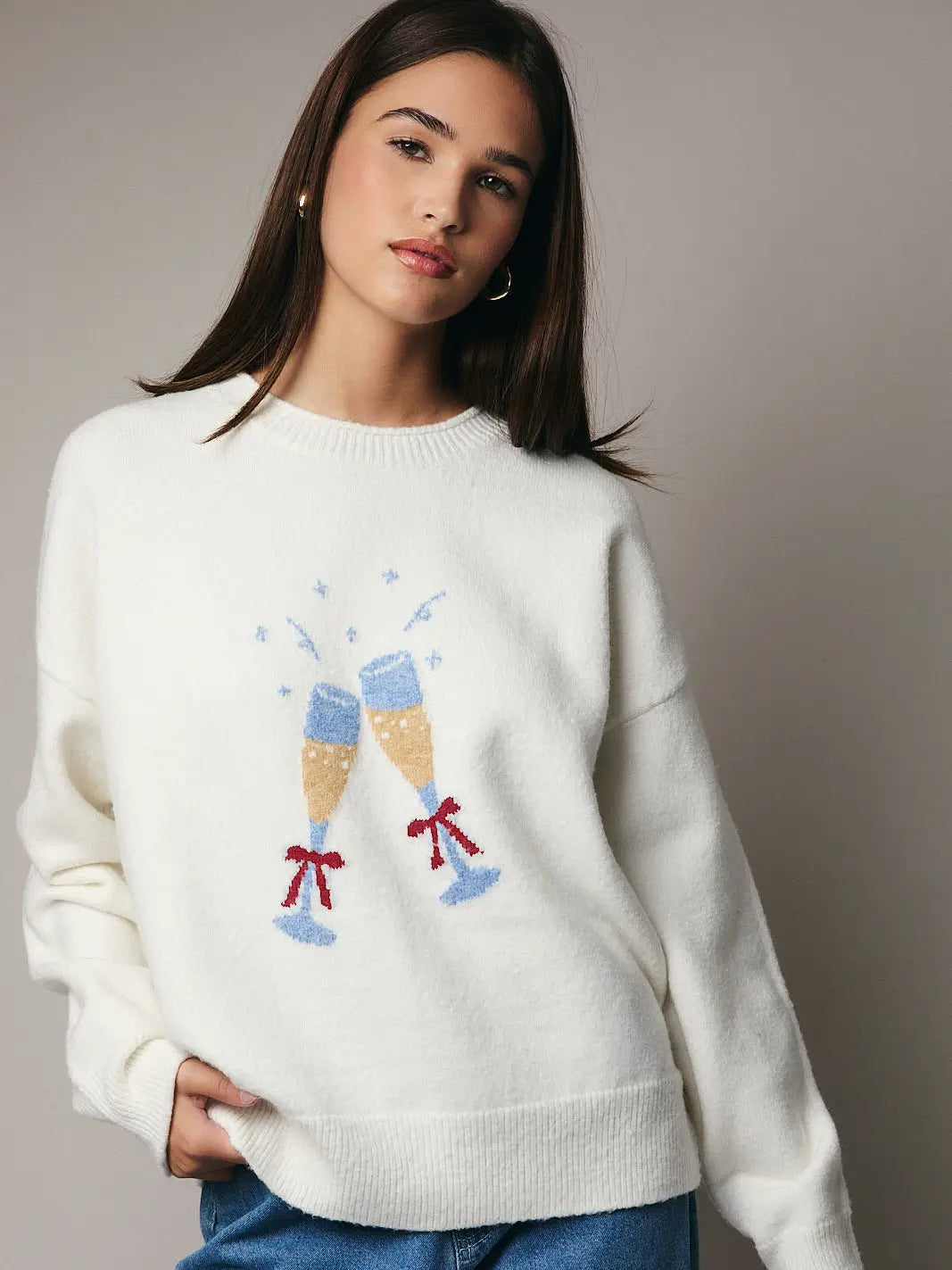 Ce sweater crème en maille douce offre une coupe ample et confortable, parfaite pour ajouter une touche de festivité grâce à son imprimé pétillant de flûtes de champagne, à la fois ludique et élégant. Facile à associer, il apporte une allure décontractée mais soignée, idéale avec un pantalon ample ou un jean.