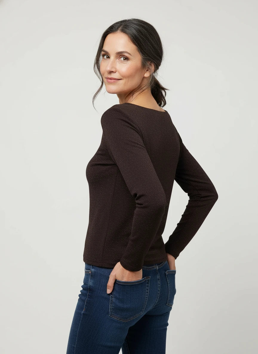 Ce haut séduit par son allure raffinée et subtilement brillante !