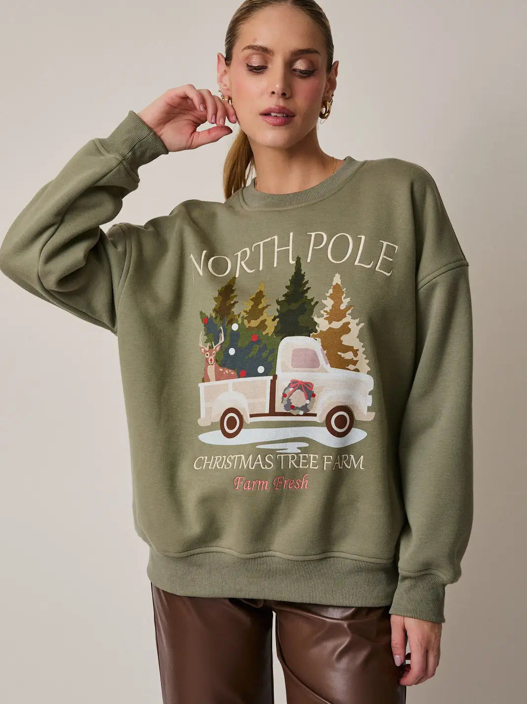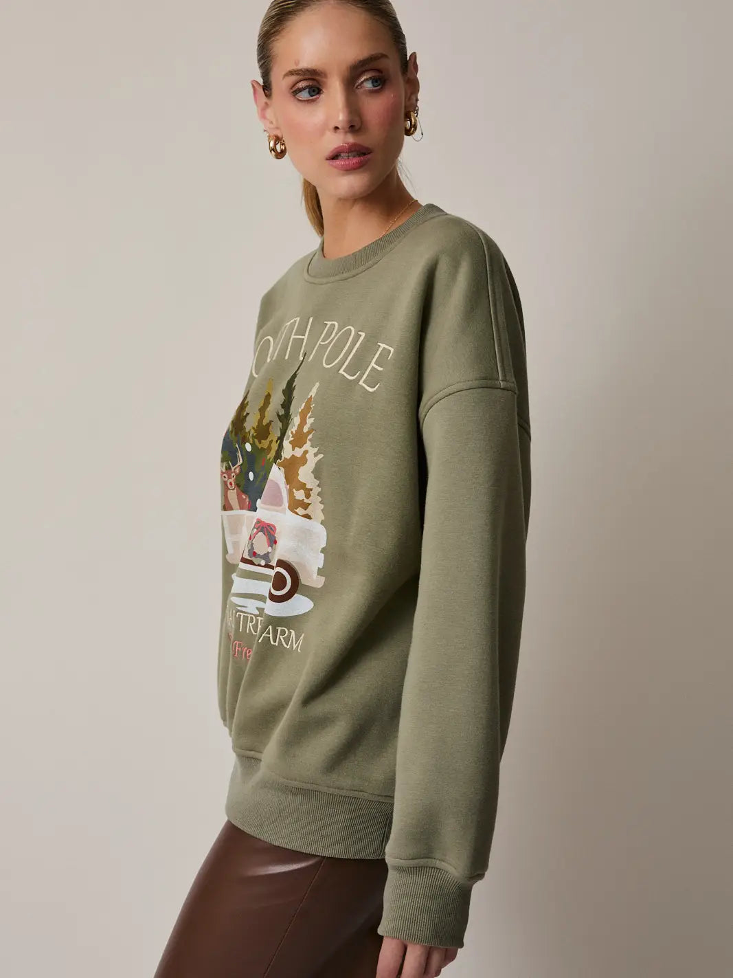 Ce sweatshirt vert ample vous plonge dans la magie des fêtes grâce à son imprimé rétro et sa matière mi-épaisse ultra confortable. Idéal pour un look décontracté ou festif.