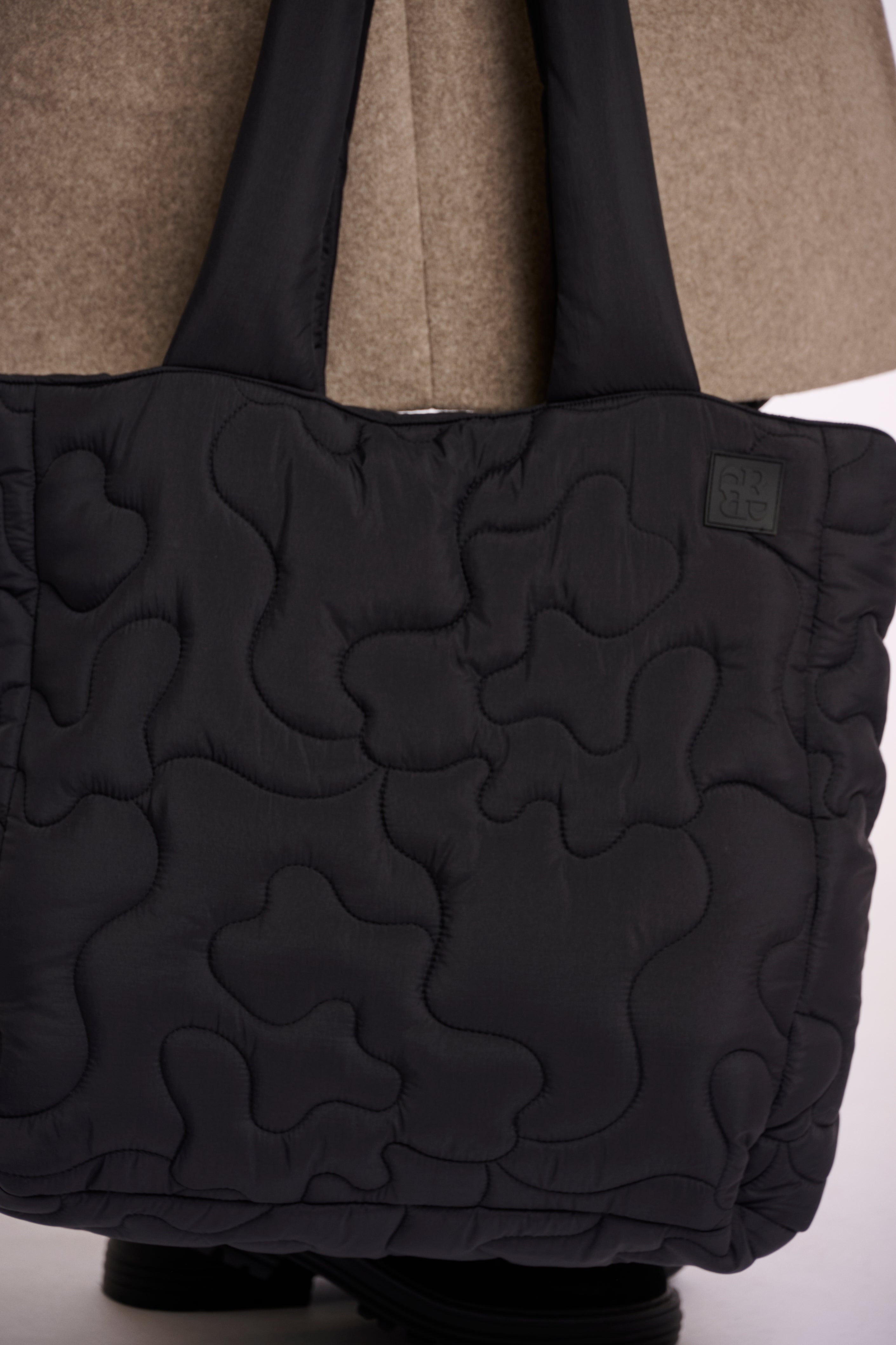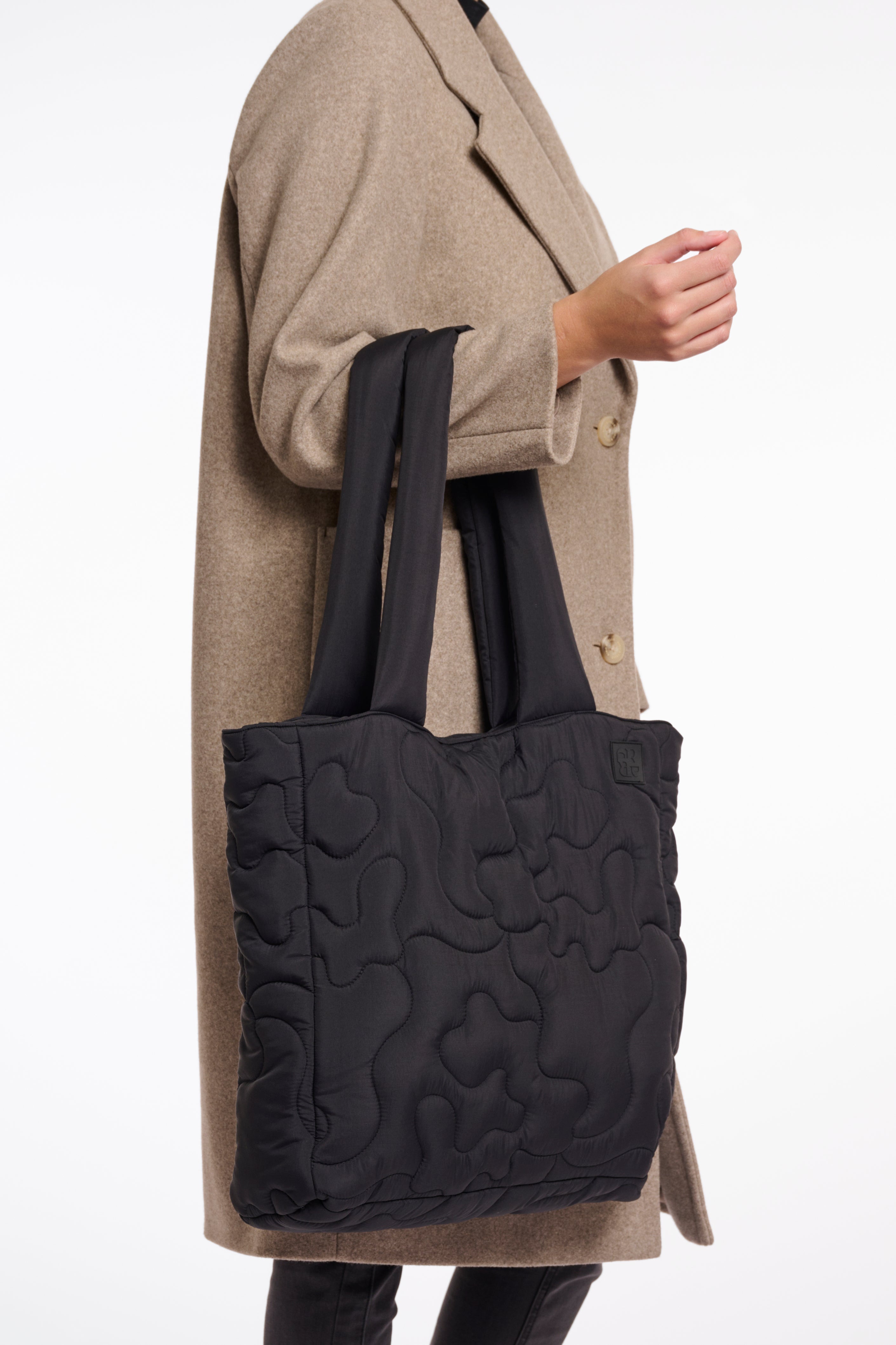 Un sac qui conjugue style graphique et confort absolu. Ce cabas oversize en tissu matelassé noire séduit par son motif abstrait et sa texture douce, presque duveteuse.
