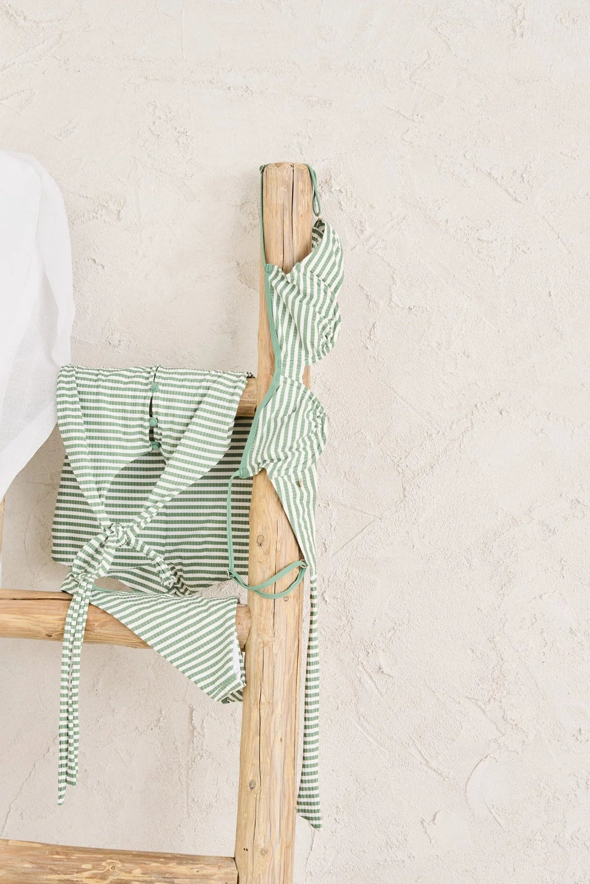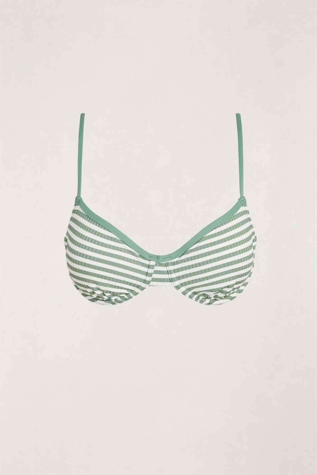 Le haut de maillot à armatures côtelé de couleur olive allie structure et confort. Avec son encolure contrastée, ses fines bretelles réglables et son dos à nouer, c'est une pièce bien pensée aux lignes épurées et à la coupe confortable.