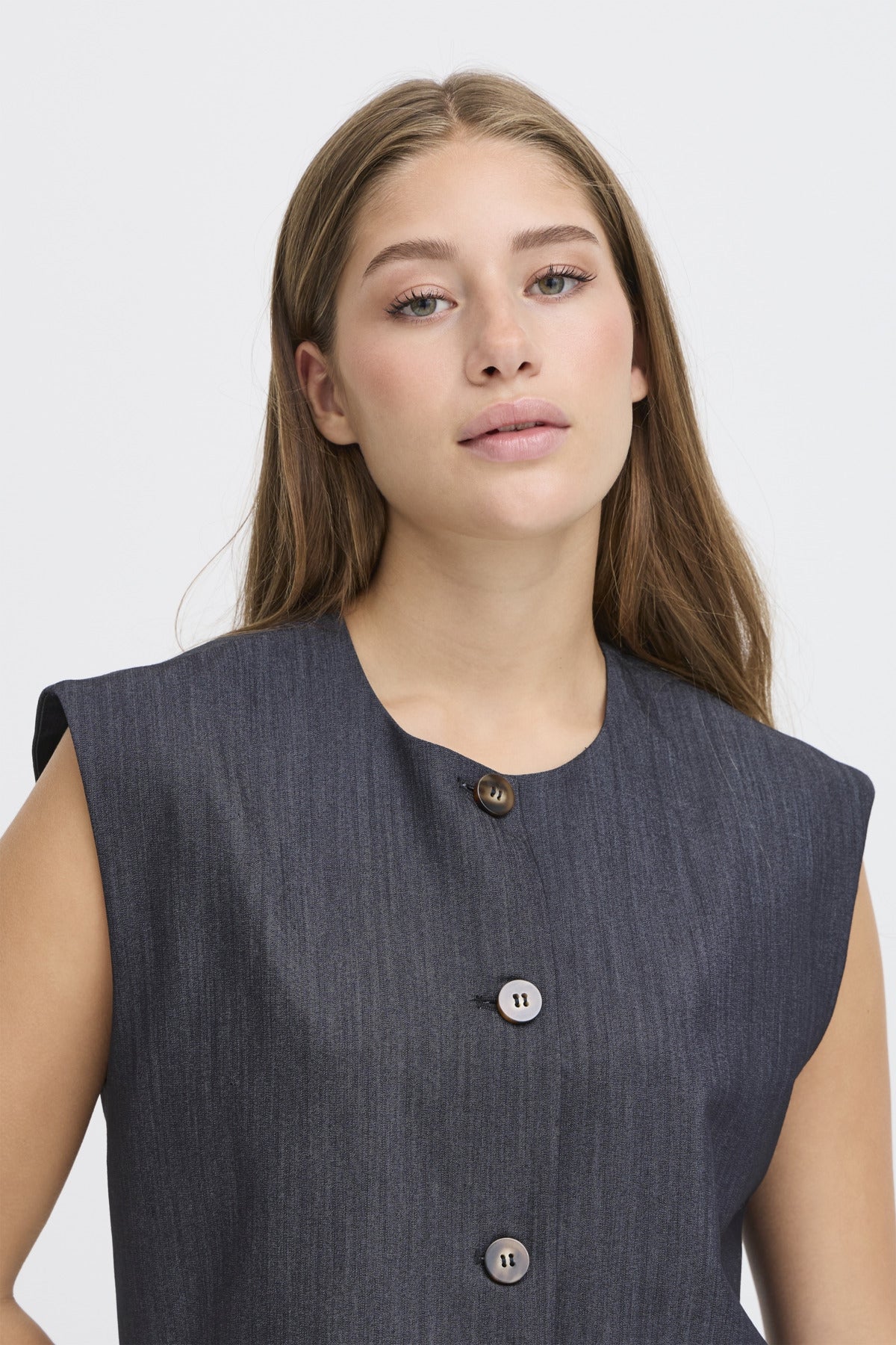 Ce gilet court sans manches présente une coupe droite et un boutonnage classique, idéal pour les tenues de bureau modernes et décontractées. Son encolure ras du cou et ses épaules structurées lui donnent une silhouette élégante.