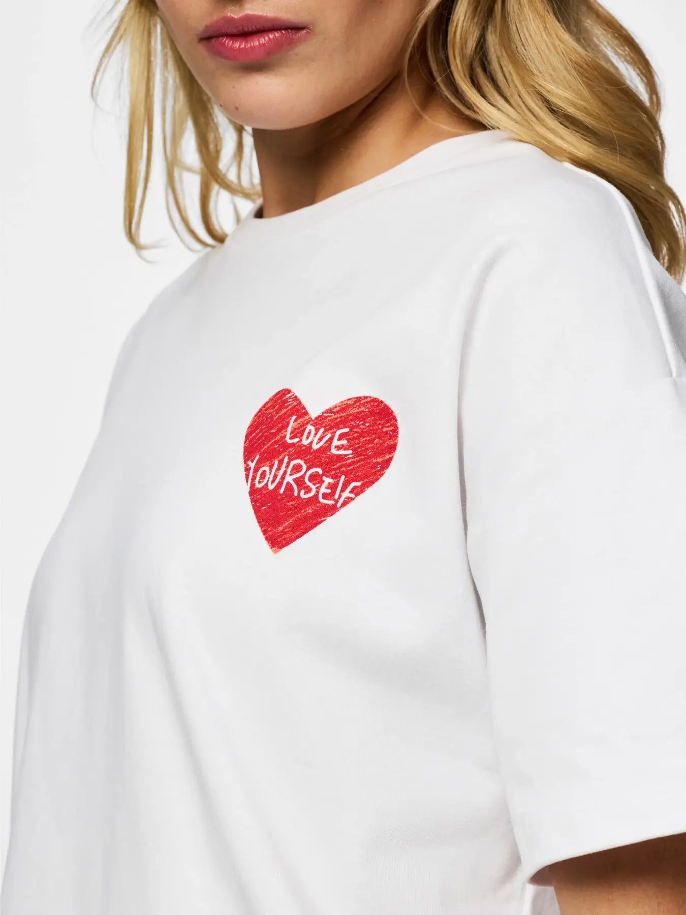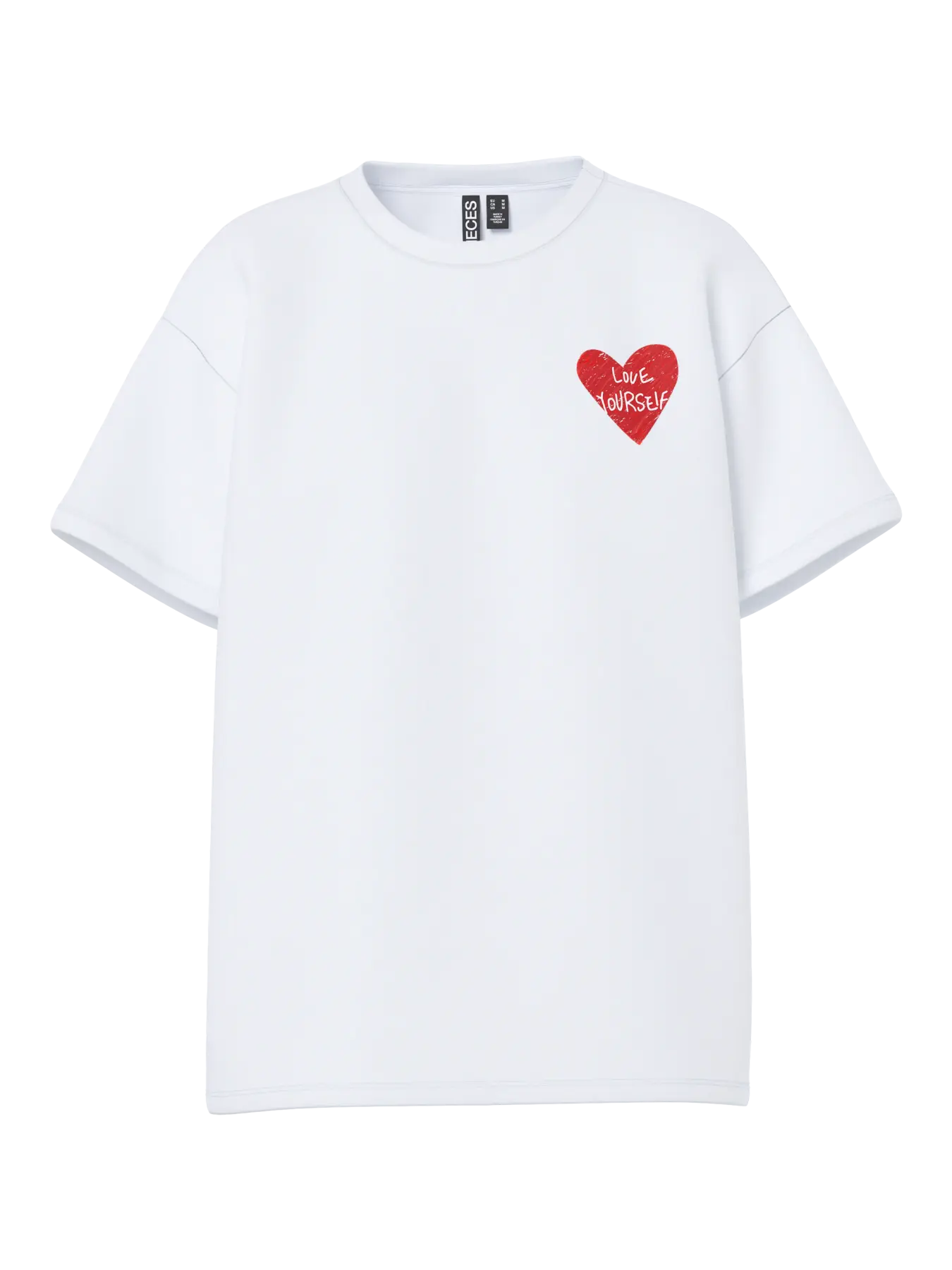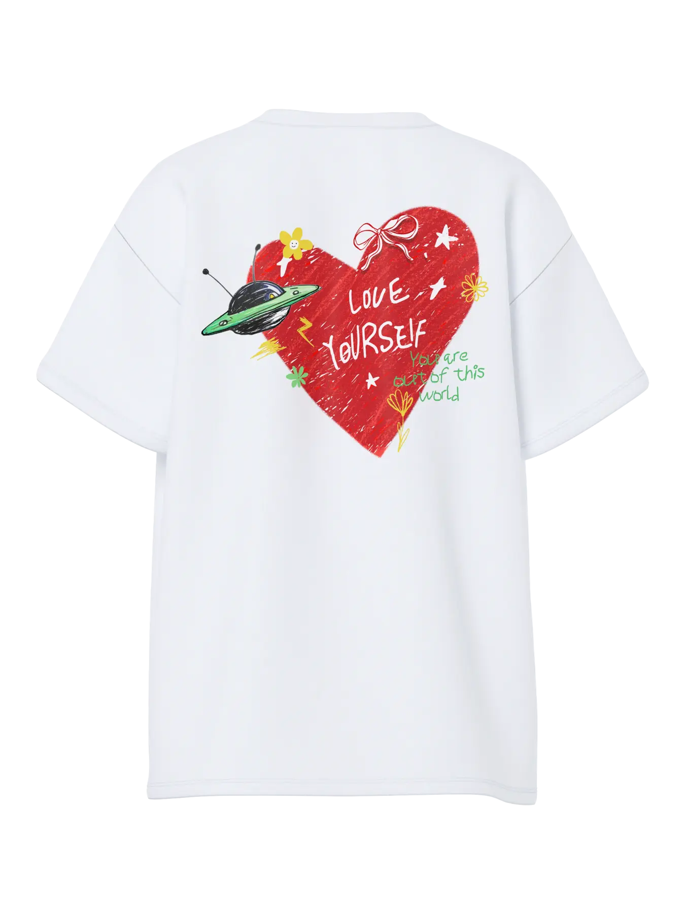 Ce t-shirt ample de couleur blanche est une pièce qui sort de l'ordinaire. Ses manches courtes, sa longueur standard et son encolure ronde le rendent intemporelle, mais il se démarque par ses motifs graphique en forme de cœur à la poitrine et au dos et son message « Love Yourself ».