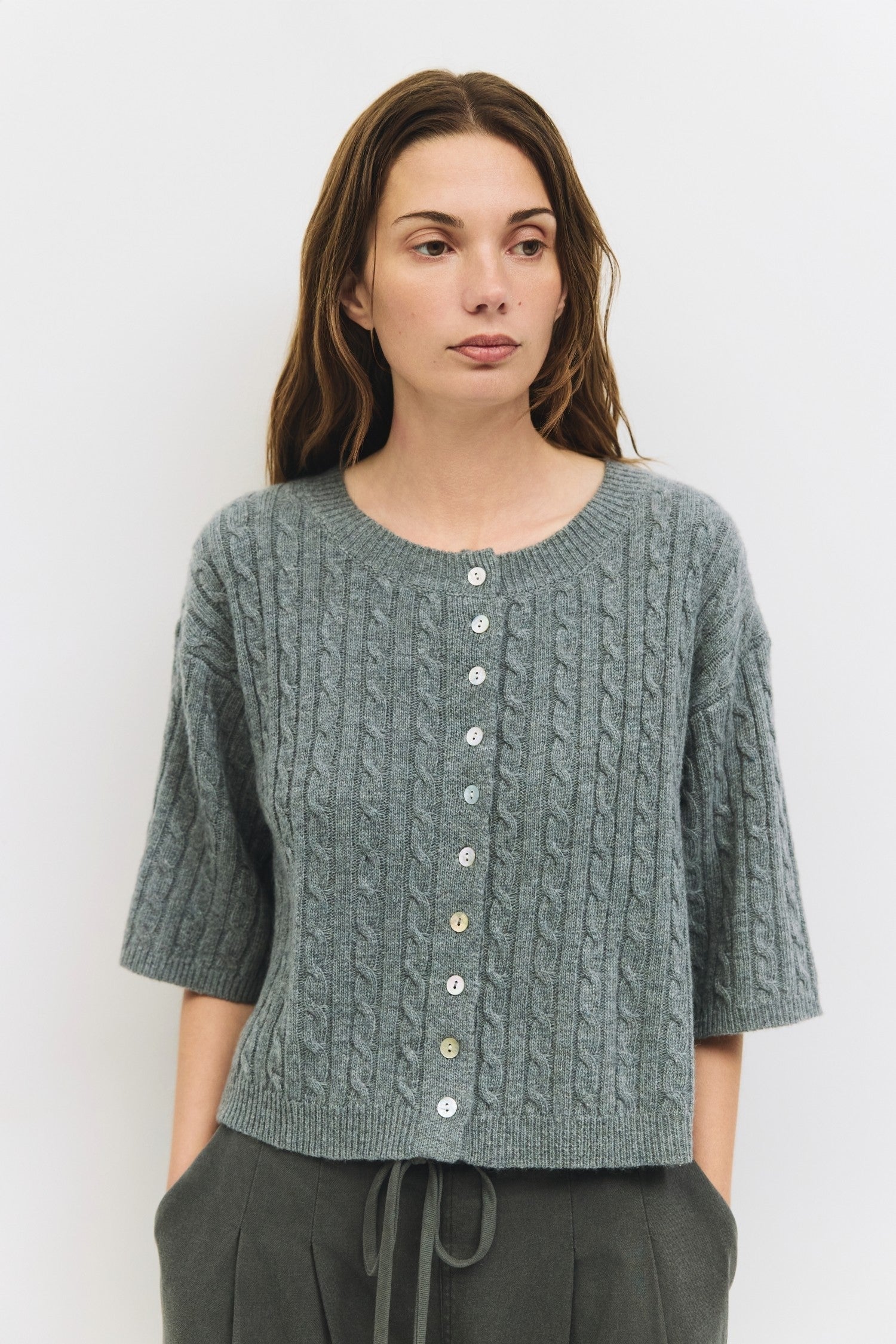 Le cardigan est une pièce décontractée, mais chic en maille torsadée d'épaisseur moyenne. Avec son large col côtelé et sa fermeture boutonnée sur le devant, c'est un indispensable à superposer.
