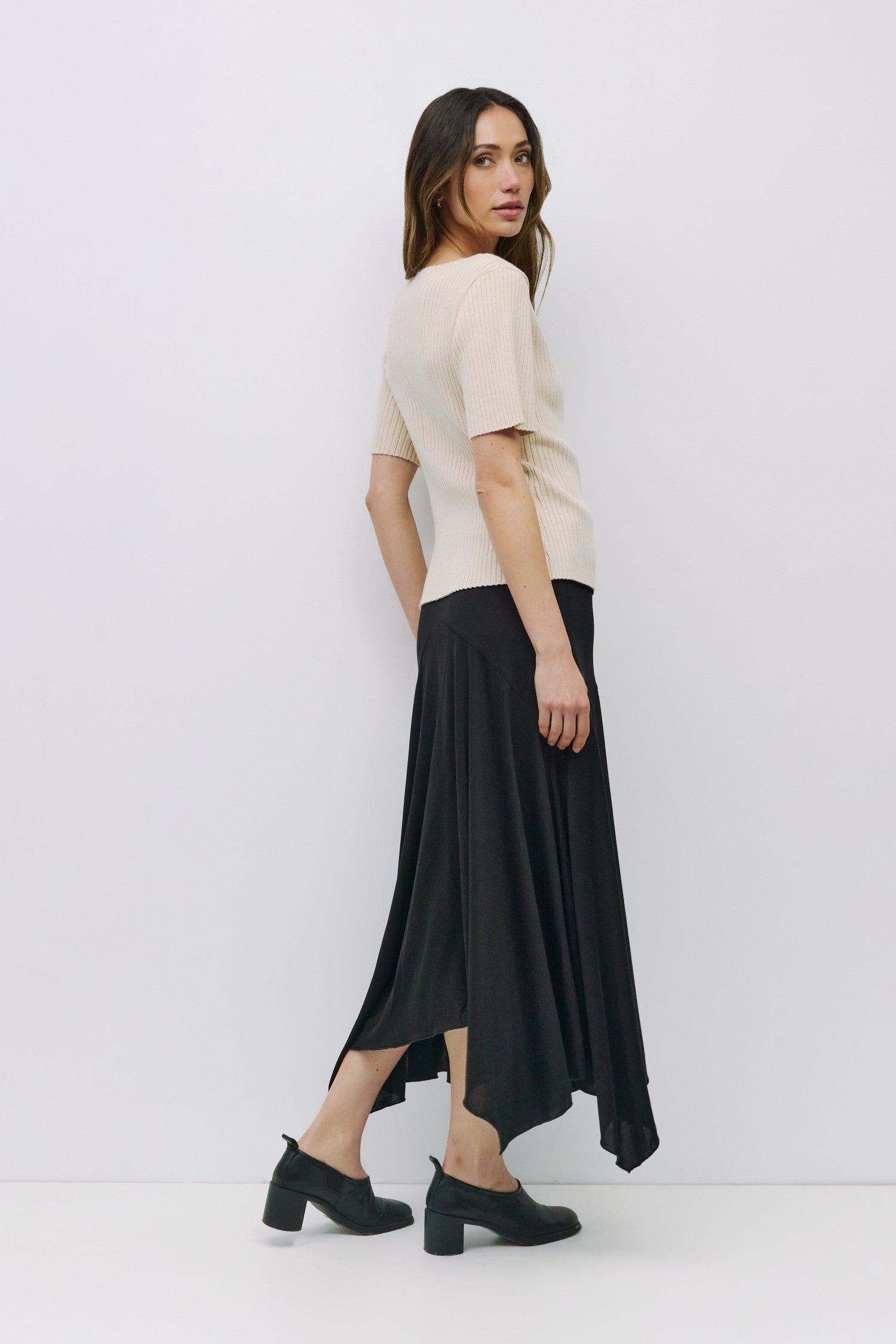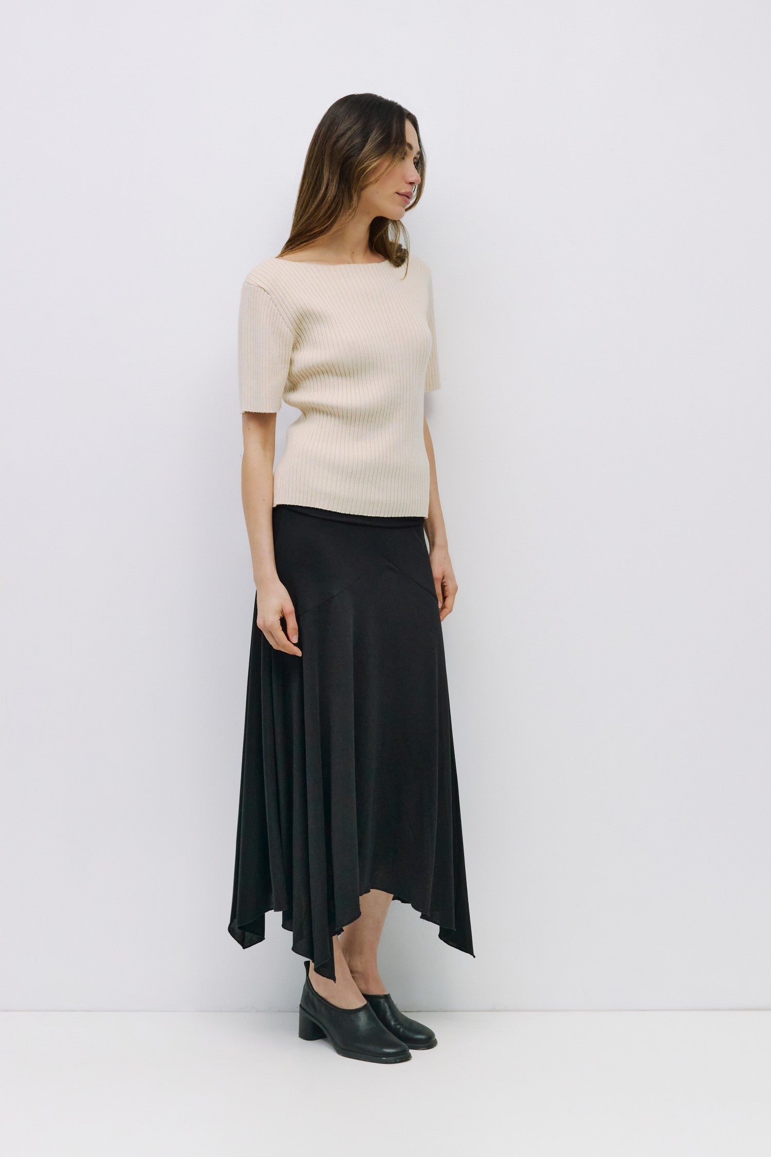 Ce haut est un essentiel polyvalent. Il se marie parfaitement avec une jupe noire pour un look chic et minimaliste, ou avec un pantalon taille haute pour une allure plus urbaine. Sa texture côtelée ajoute du relief à une tenue monochrome et lui donne une touche moderne.