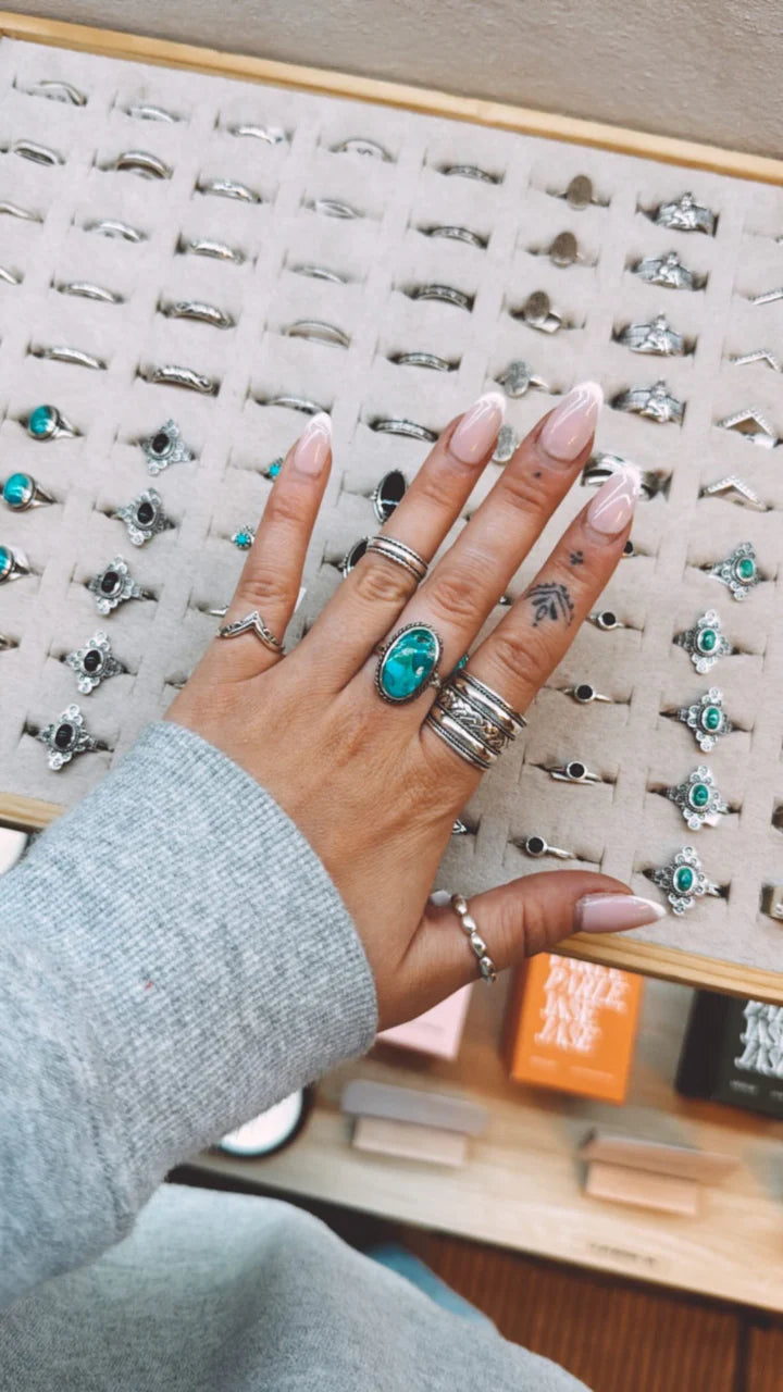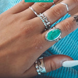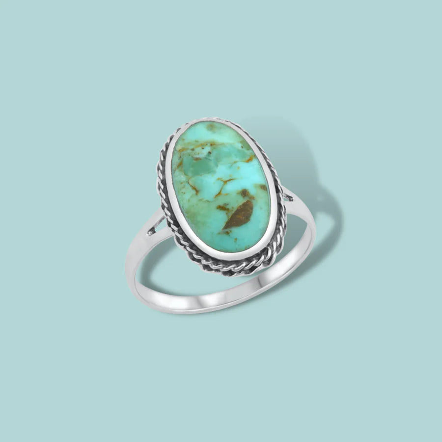 La bague Alahé - Turquoise exquise met en valeur une pierre turquoise ovale , sertie avec élégance dans un cadre en argent finement travaillé. Le détail tréssé qui borde la pierre ajoute une dimension artisanale et sophistiqué à ce bijou. Parfaite pour rehausser une tenue décontractée ou compléter un ensemble plus formel .