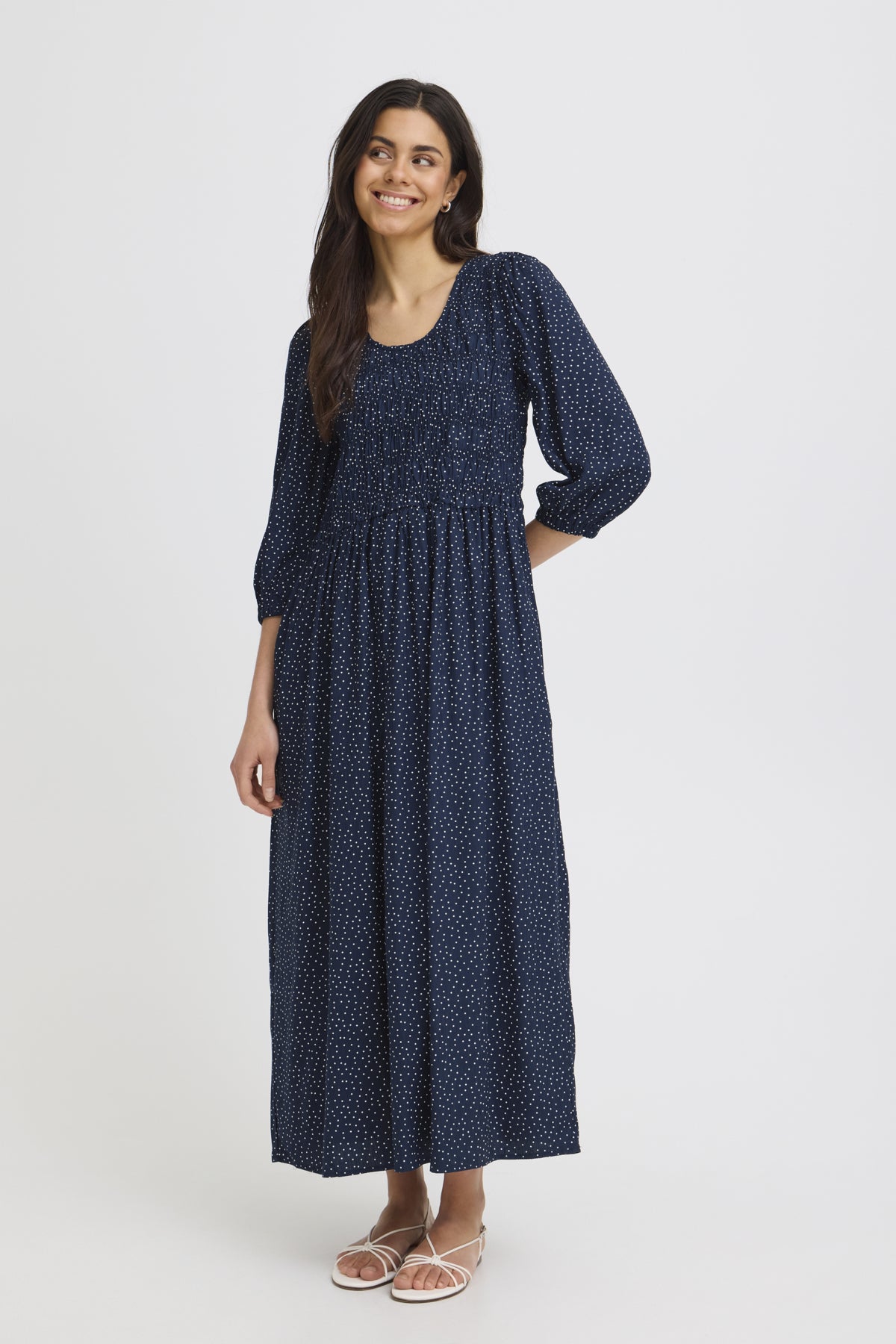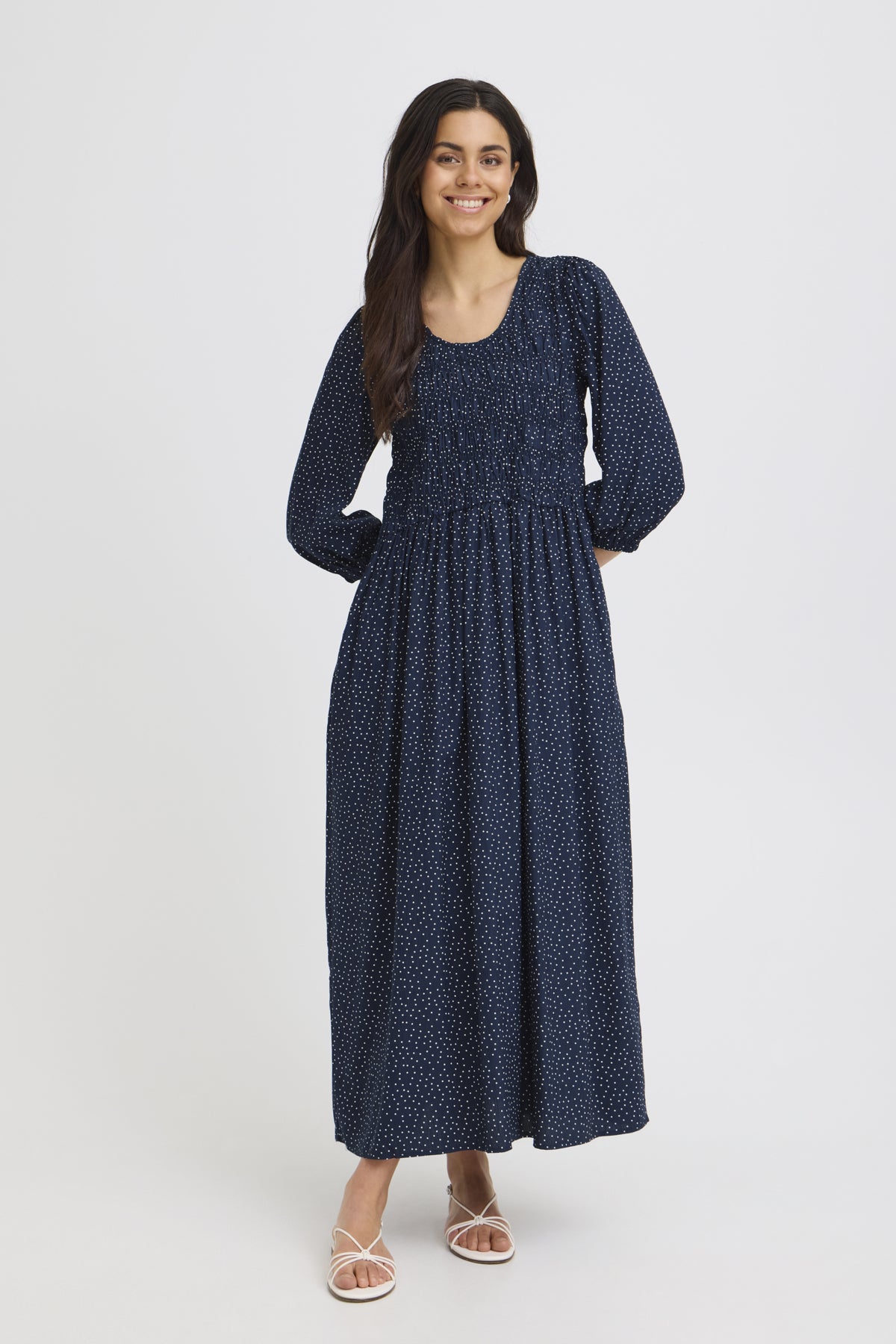 Une robe longue qui respire la simplicité raffinée. Son imprimé à pois blancs danse délicatement sur un bleu marine profond, évoquant un ciel étoilé en mouvement. Le corsage smocké épouse le buste avec justesse, offrant confort et maintien tout en dessinant une silhouette féminine et naturelle. Les manches longues ajoutent une touche de douceur, tandis que la jupe fluide accompagne chaque pas avec légèreté. Portée avec des sandales ou des bottines, elle traverse les saisons avec une élégance sans effort