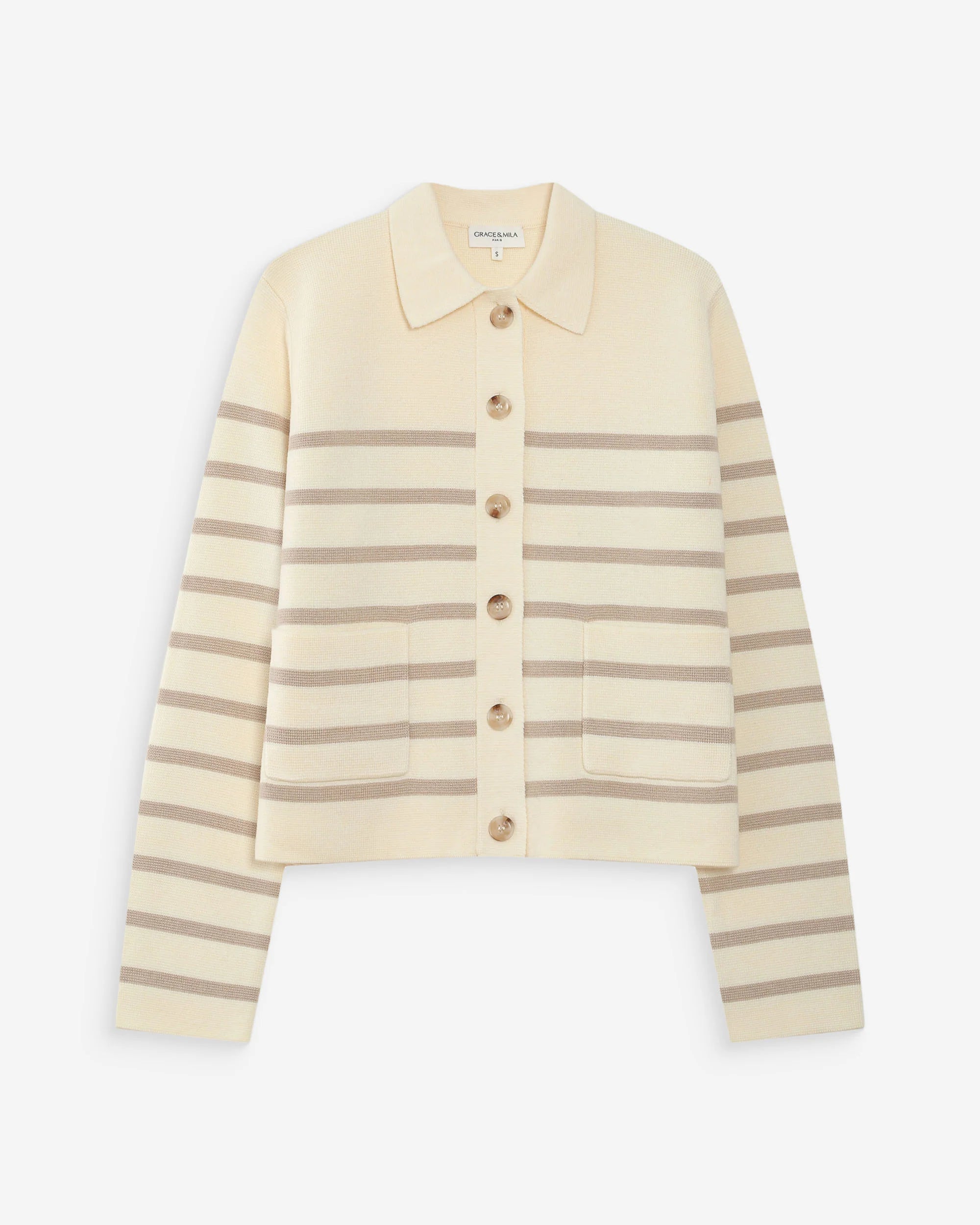 Le cardigan boutonné présente une coupe droite, un col chemise et une patte de boutonnage sur le devant, créant une silhouette classique et intemporelle. Ce modèle est doté d'une patte de boutonnage et de poches plaquées sur le devant.