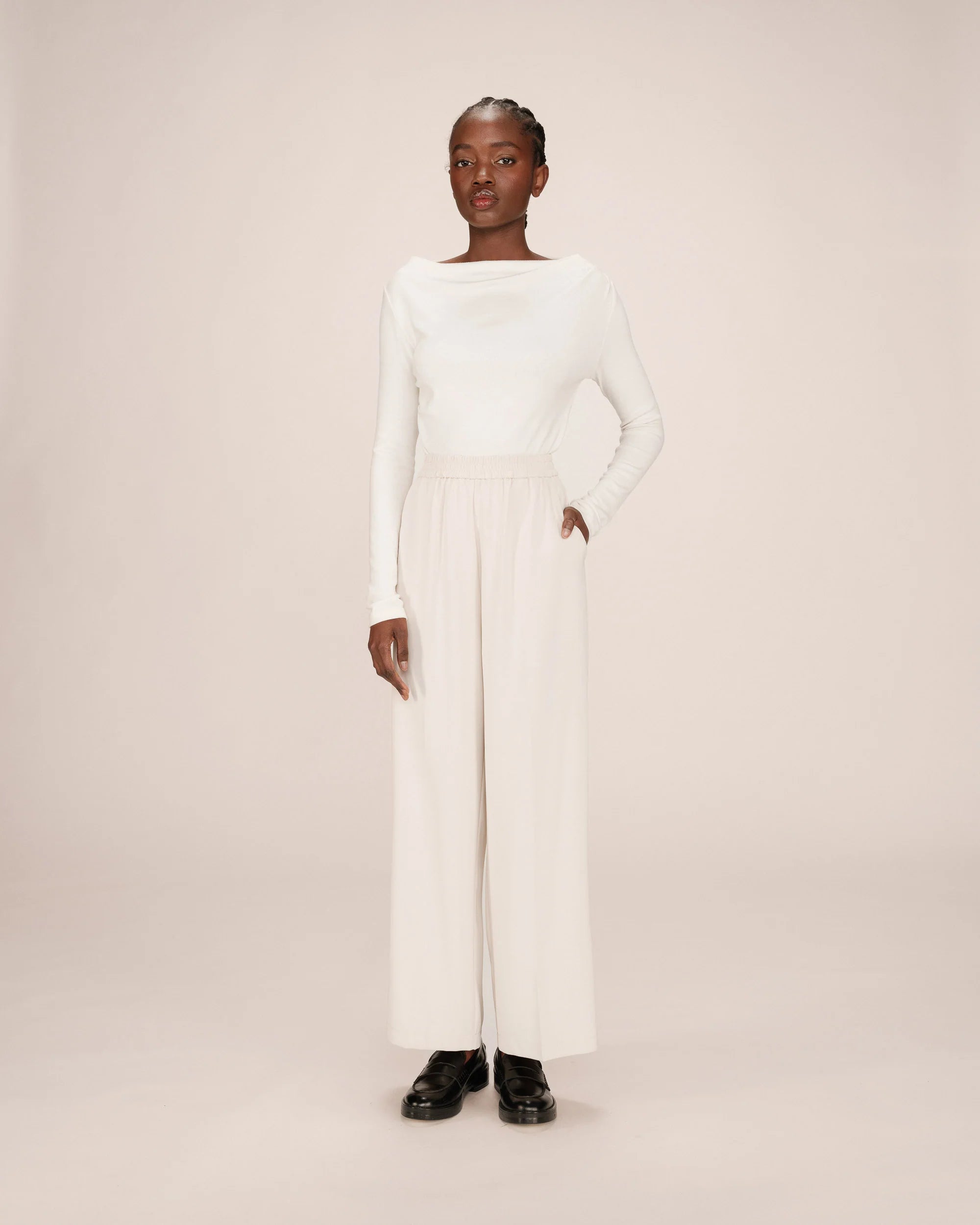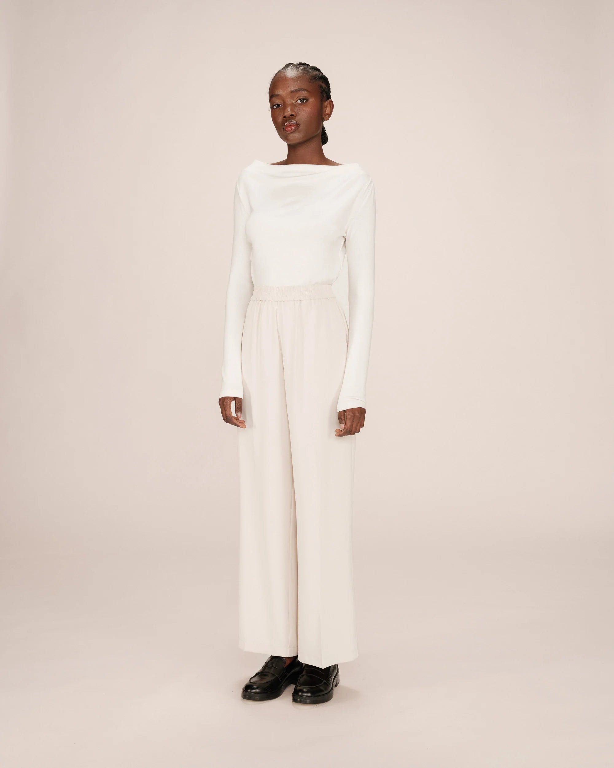 Le pantalon est un pantalon à jambes larges avec une taille élastiquée, créant une silhouette décontractée. Fluide et léger, le pantalon est confortable à porter. Ce basique de la garde-robe est parfait pour un look casual au quotidien.