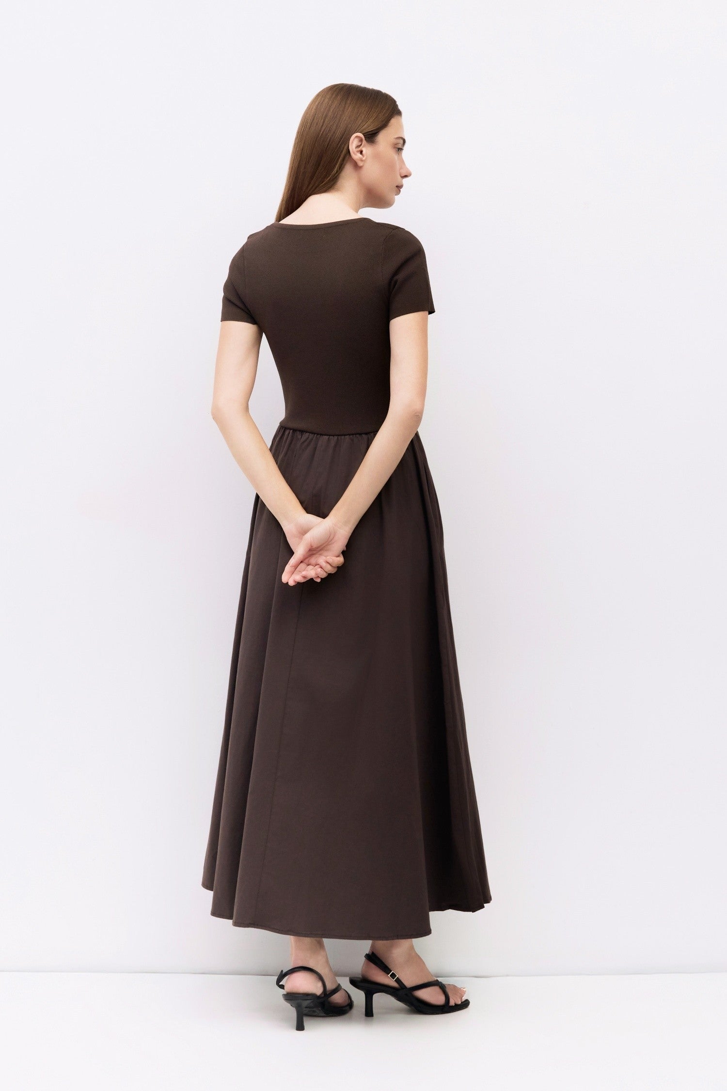 La robe associe un haut en maille ajusté à encolure dégagée à une jupe longue légère et ample. Des fronces à la taille et une fermeture éclair latérale créent une silhouette flatteuse et une liberté de mouvement optimale.