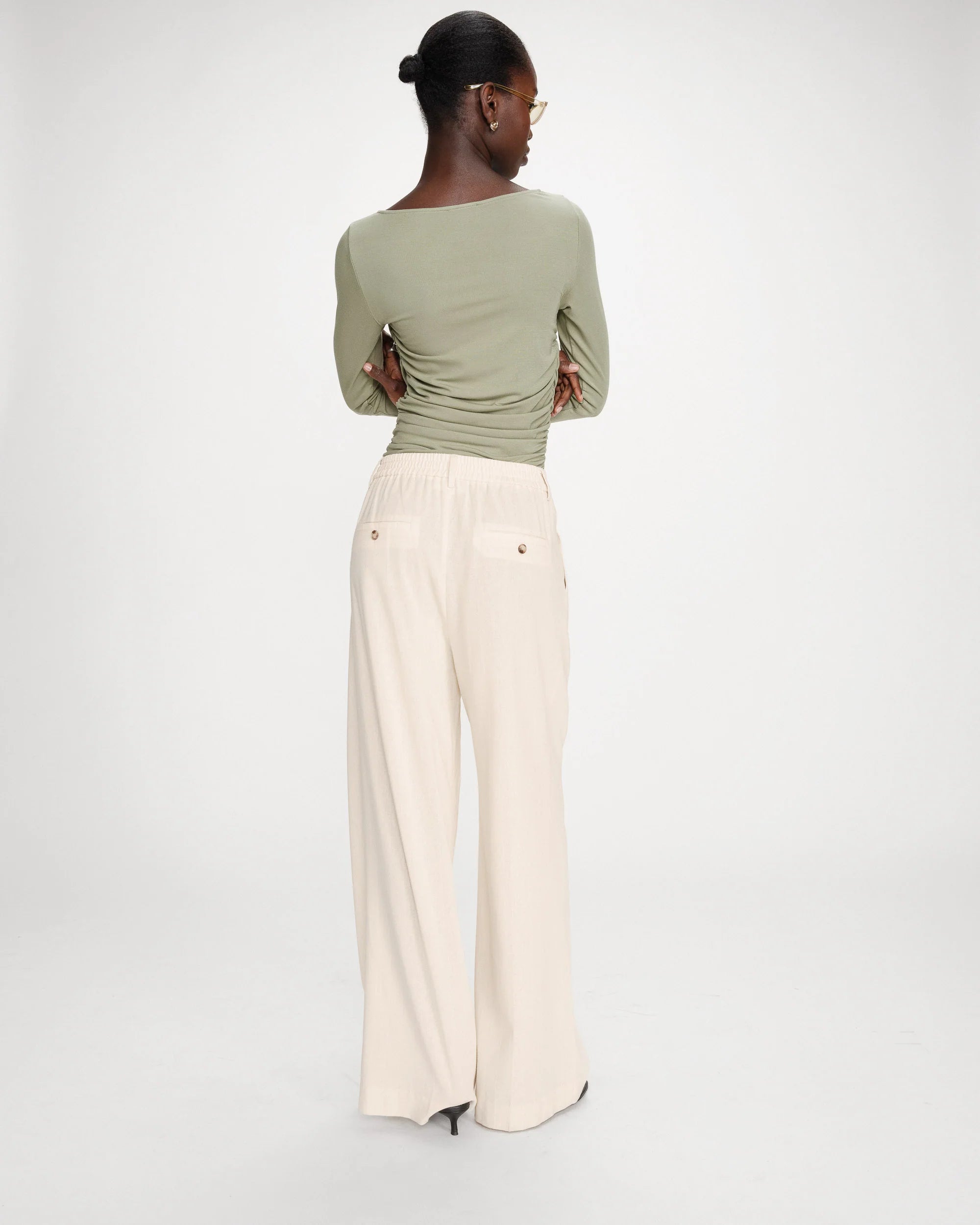 Le pantalon large est confectionné dans un mélange de lin pour un drapé naturel et élégant. La taille haute élastiquée au dos et les plis marqués structurent la silhouette. La coupe droite et moderne du pantalon en lin allie confort et style.