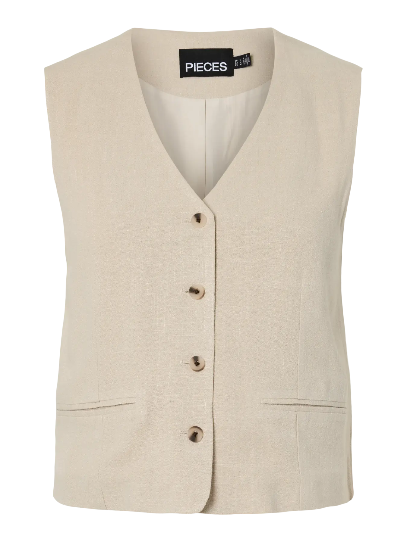 Ce gilet sans manches beige présente une coupe droite intemporelle. Son boutonnage à l'avant et son encolure en V lui accordent un style sophistiqué et passe-partout. Sa couleur se démarque sur une paire de jeans bleu.